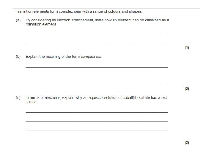 Formation of Coloured ions • TM can be identified by their colour. • You need to know: 1. How colour arises 2. Colours of the ions on the specification