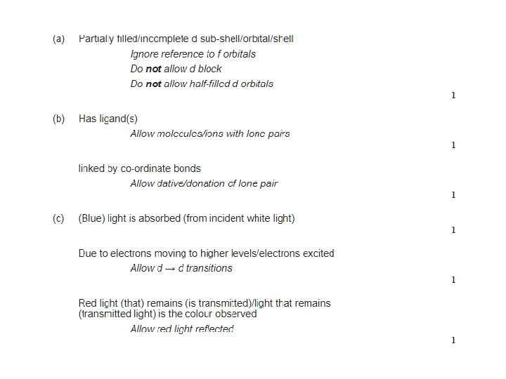 Complimentary Colours • Shown opposite each other • When white light passes through a solution containing a transition metal complex, some of the wavelengths of light are absorbed by the complex. • The light emerging will therefore contain proportionally more of the complimentary colour. • E. g. if a complex absorbs red light, the light emerging will look blue or green.
