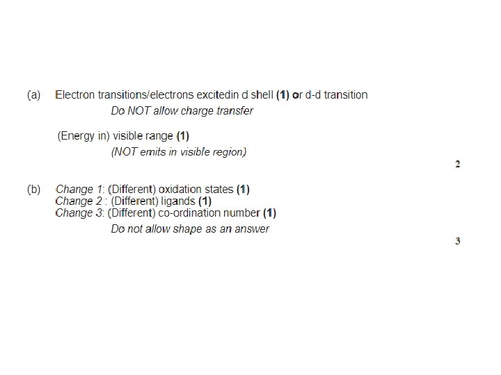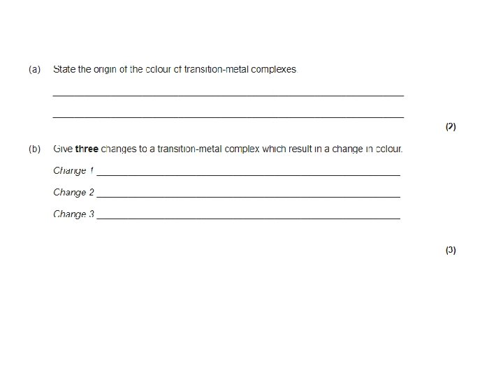 Questions • Look at the colour wheel to help answer the following questions: 1) Fe 3+ (aq) ions look yellow. a) What is the complimentary colour? How would you describe the difference in energy levels? Describe the frequency and wavelength of the radiation absorbed b) c)