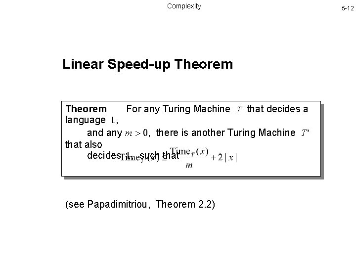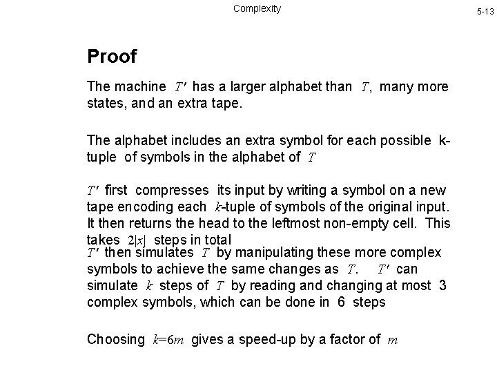 Complexity Linear Speed-up Theorem For any Turing Machine T that decides a language L, and any m > 0, there is another Turing Machine T’ that also decides L, such that (see Papadimitriou, Theorem 2. 2) 5 -12