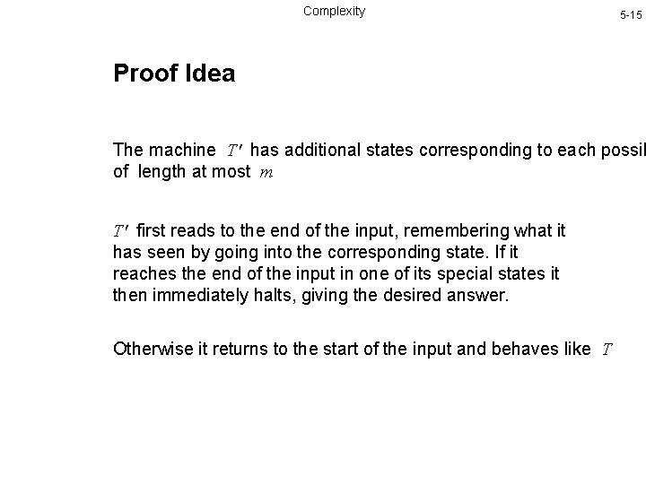Complexity 5 -15 Proof Idea The machine T' has additional states corresponding to each possib of length at most m T' first reads to the end of the input, remembering what it has seen by going into the corresponding state. If it reaches the end of the input in one of its special states it then immediately halts, giving the desired answer. Otherwise it returns to the start of the input and behaves like T