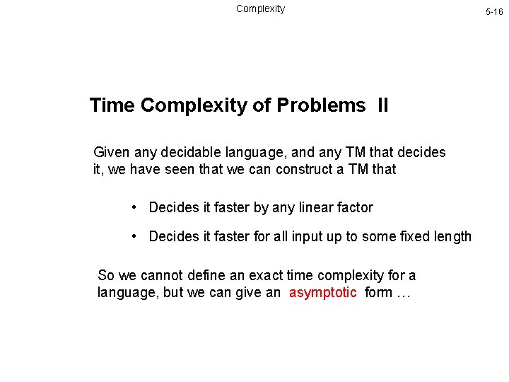 Complexity Time Complexity of Problems II Given any decidable language, and any TM that decides it, we have seen that we can construct a TM that • Decides it faster by any linear factor • Decides it faster for all input up to some fixed length So we cannot define an exact time complexity for a language, but we can give an asymptotic form … 5 -16