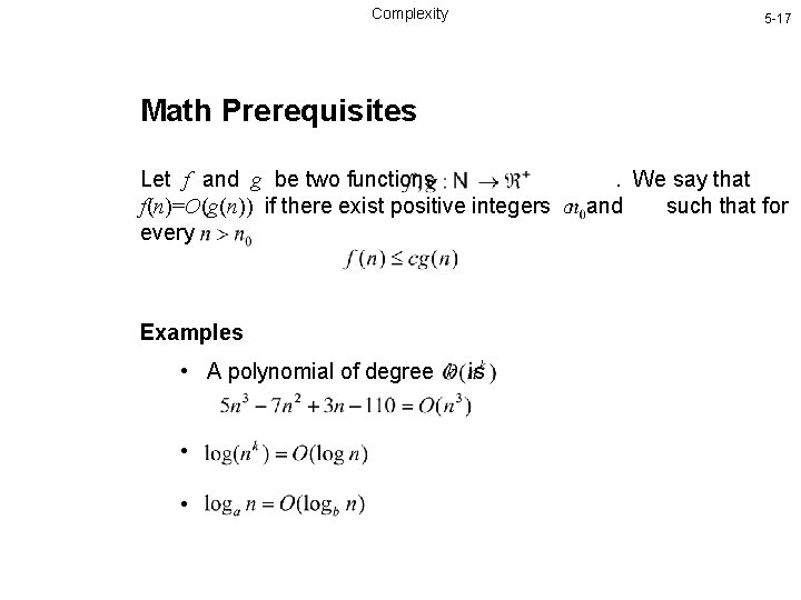 Complexity 5 -17 Math Prerequisites Let f and g be two functions. We say that f(n)=O(g(n)) if there exist positive integers c and such that for every Examples • A polynomial of degree k is • •