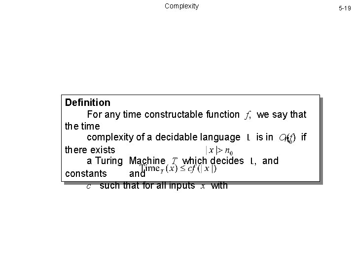 Complexity Definition For any time constructable function f, we say that the time complexity of a decidable language L is in O(f) if there exists a Turing Machine T which decides L, and constants and c such that for all inputs x with 5 -19