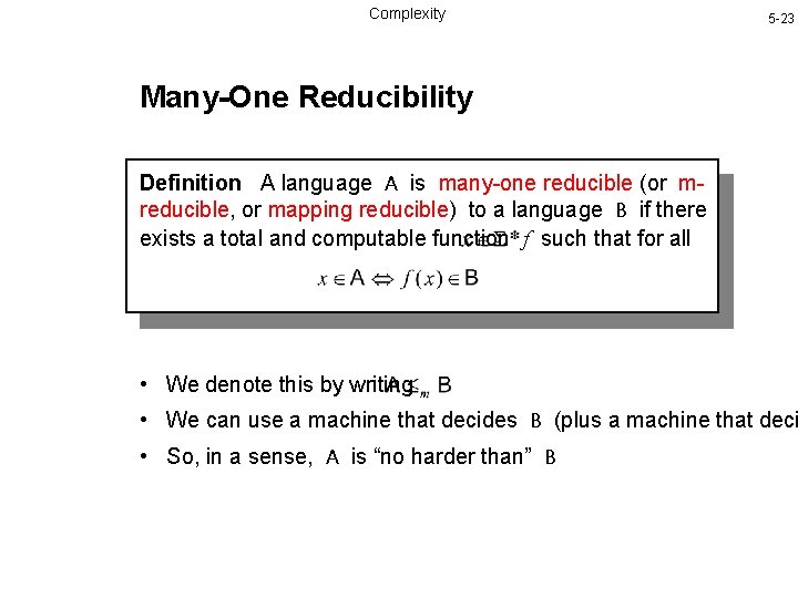 Complexity 5 -23 Many-One Reducibility Definition A language A is many-one reducible (or mreducible, or mapping reducible) to a language B if there exists a total and computable function f such that for all • We denote this by writing • We can use a machine that decides B (plus a machine that deci • So, in a sense, A is “no harder than” B