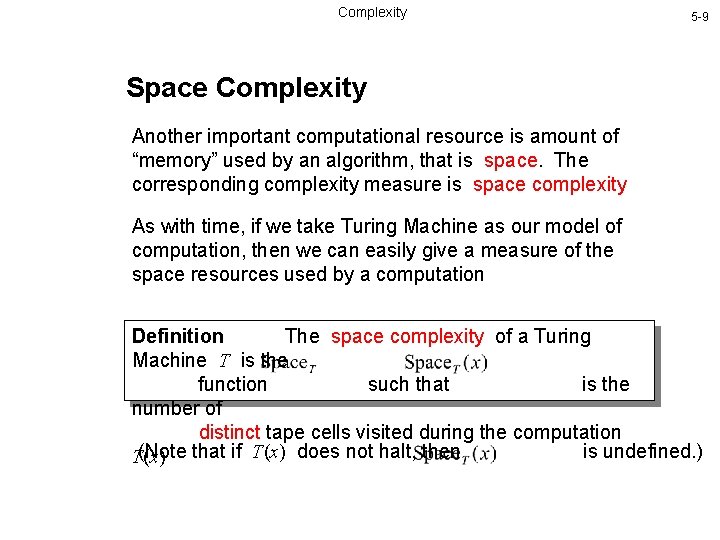 Complexity 5 -9 Space Complexity Another important computational resource is amount of “memory” used by an algorithm, that is space. The corresponding complexity measure is space complexity As with time, if we take Turing Machine as our model of computation, then we can easily give a measure of the space resources used by a computation Definition The space complexity of a Turing Machine T is the function such that is the number of distinct tape cells visited during the computation (Note that if T(x) does not halt, then is undefined. ) T(x)