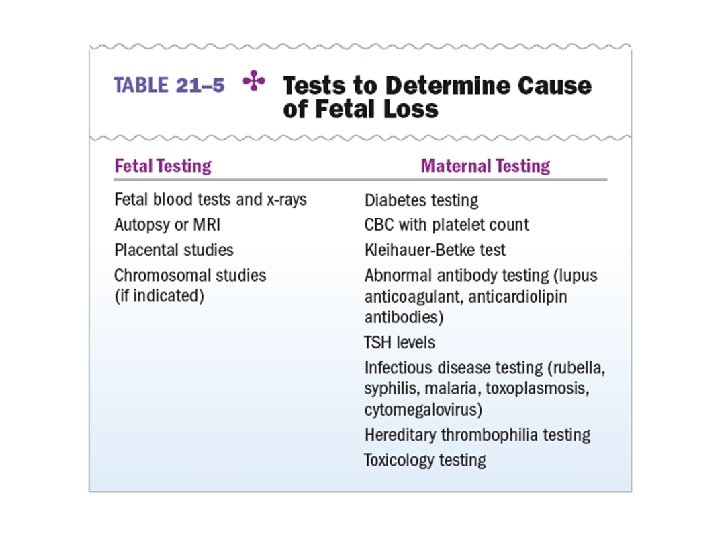 Nursing Care – Fetal Loss (cont’d) • Nursing care involves supporting family through grief work – Prepare items for family to keep to remember infant – Provide opportunities for religious or spiritual counseling and cultural practices – Visit or phone family after discharge to assist in closure – Make referral to appropriate perinatal loss counseling services if indicated