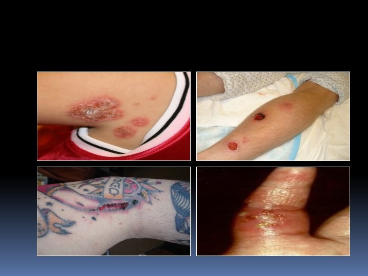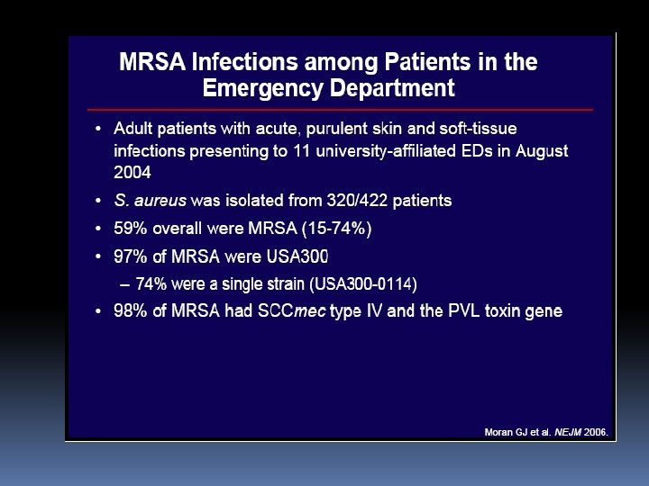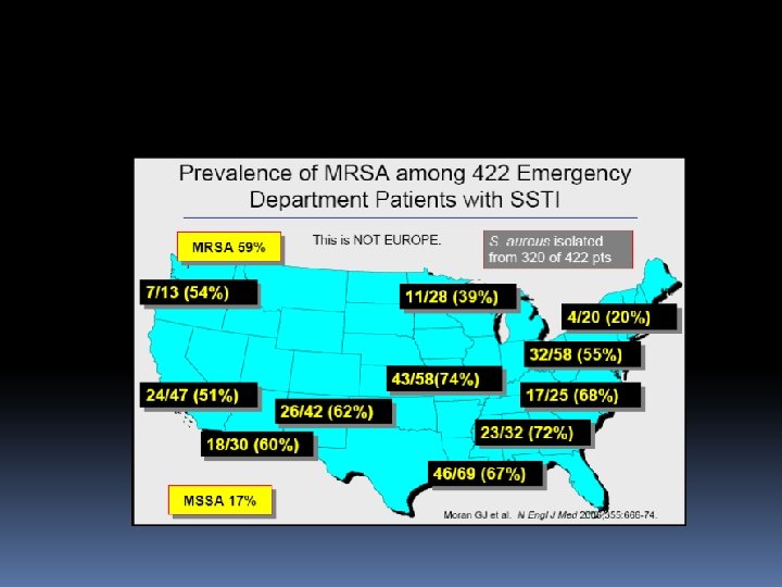 CA-MRSA Infections are Mainly Skin Infections Disease Syndrome Skin/soft tissue Wound (Traumatic) (%) 1, 266 (77%) 157 (10%) Urinary Tract Infection 64 (4%) Sinusitis 61 (4%) Bacteremia 43 (3%) Pneumonia 31 (2%) Fridkin et al NEJM 2005; 352: 1436 -44