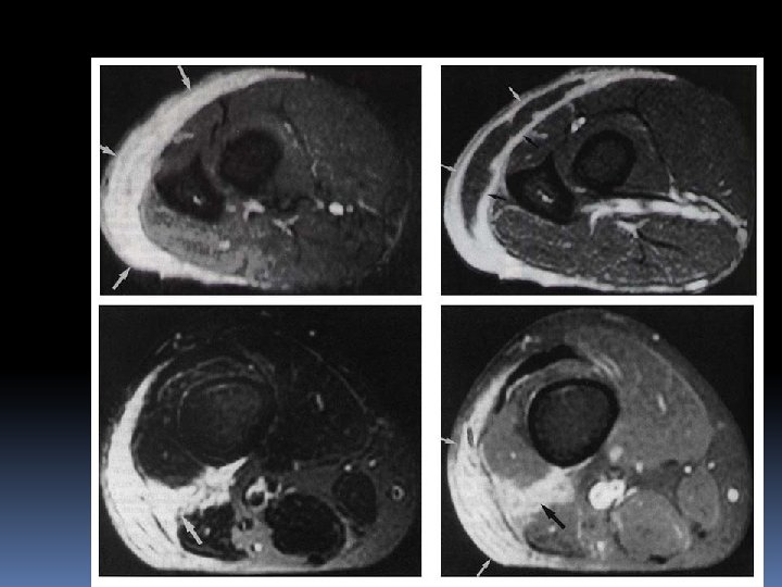 What are the Clinical Features of Necrotizing Fasciitis? The most common site of infection is the distal lower limb, although fascial extension up the leg is common. The progression is often alarmingly rapid from a silent or apparently minor process to a fulminant condition with clinical features of systemic toxicity, extensive destruction with threat to the affected limb, and even imminent death. The first clue may be unexplained and rapidly worsening pain By the time the bullae have appeared, there is usually already extensive necrosis.
