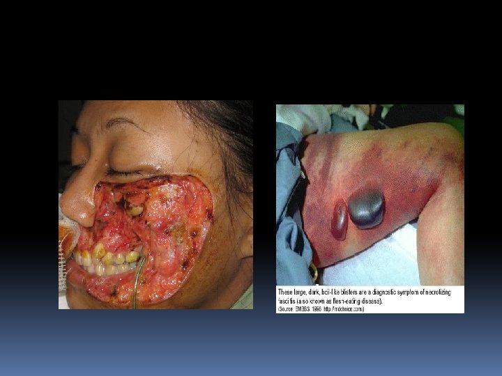 Ncrotizing Facitis is LIMB + LIFE threatening Immediate extensive surgical debridement must be done ASAP CLINDAMYCIN must be give , it also has antitoxin action