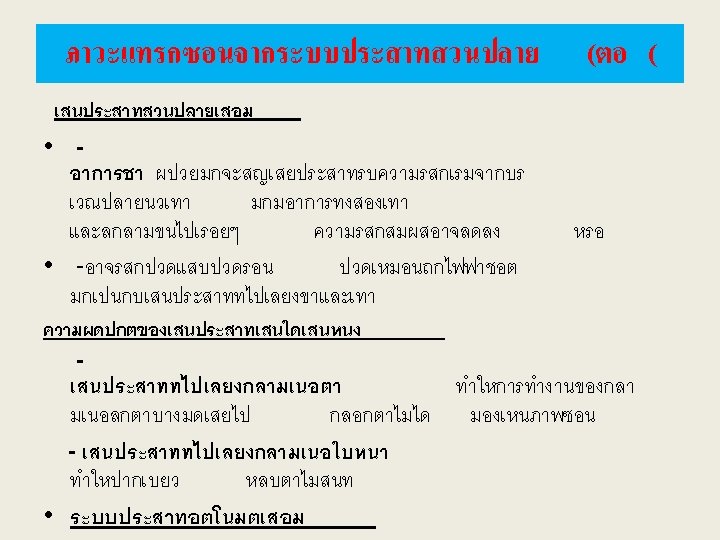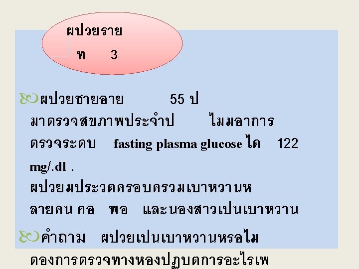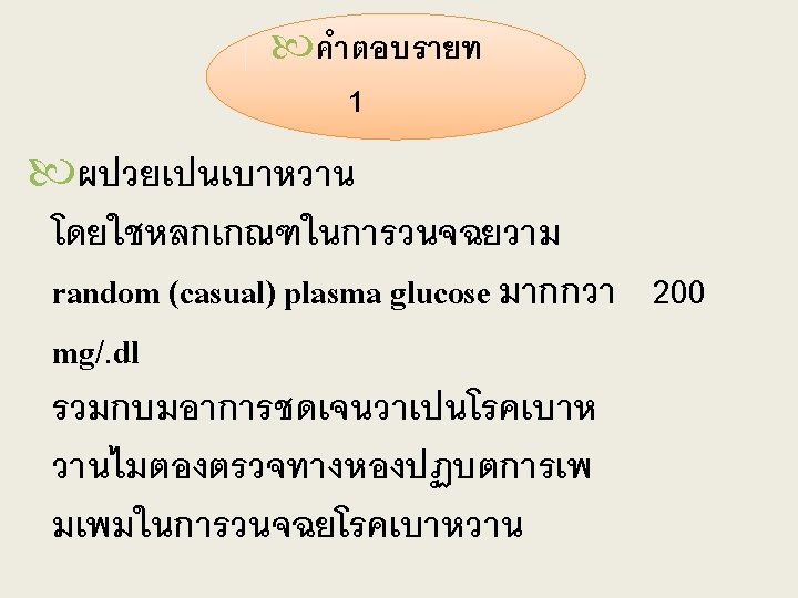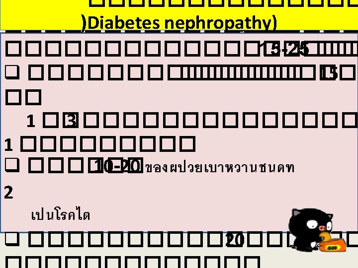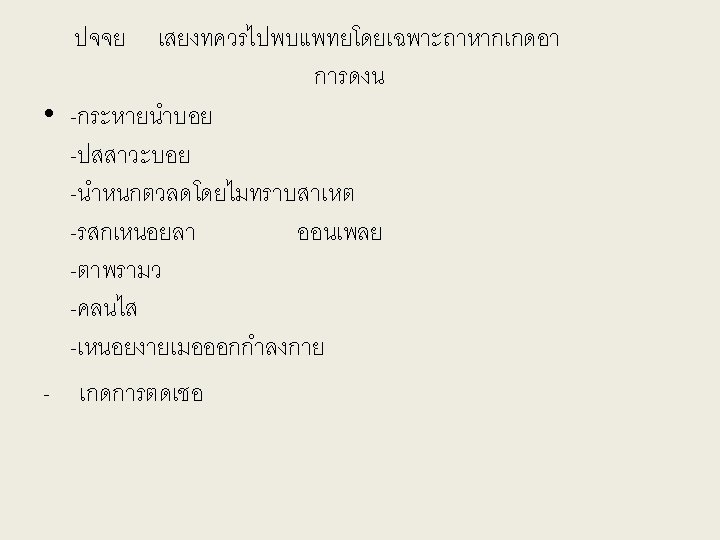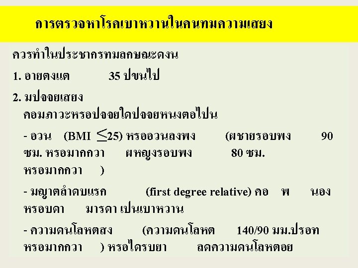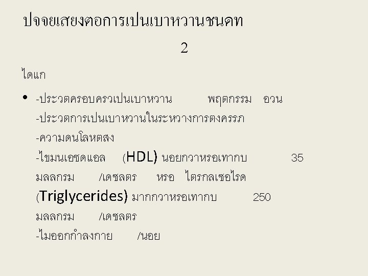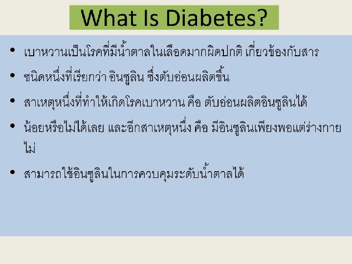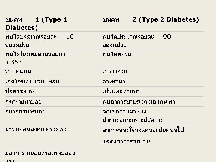 • SIGNS & SYMPTOMS • Polyphagia – frequent hunger, especially pronounced hunger • Polydipsia – frequent thirst, especially excessive thirst • Polyuria – increased volume of urination (not an increased frequency for urination) • Blurred vision • Fatigue • Restlessness Weight loss