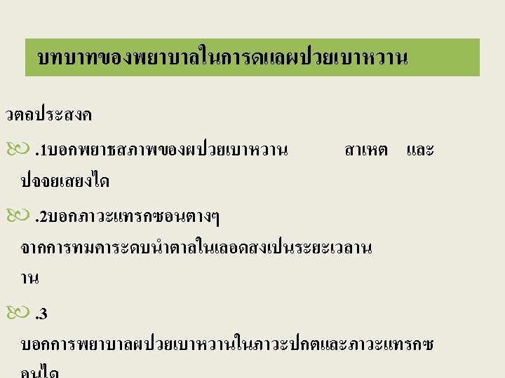 8. Risk for Infection related to: • high glucose levels reduction in leukocyte function. 9. Imbalanced Nutrition, Less Than Body Requirement related to poor nutrition intake. • Check serum glucose before and after meals. • Monitor: glucose, pallor, cold sweat, skin moist. • Monitor vital signs. • Monitor consciousness.