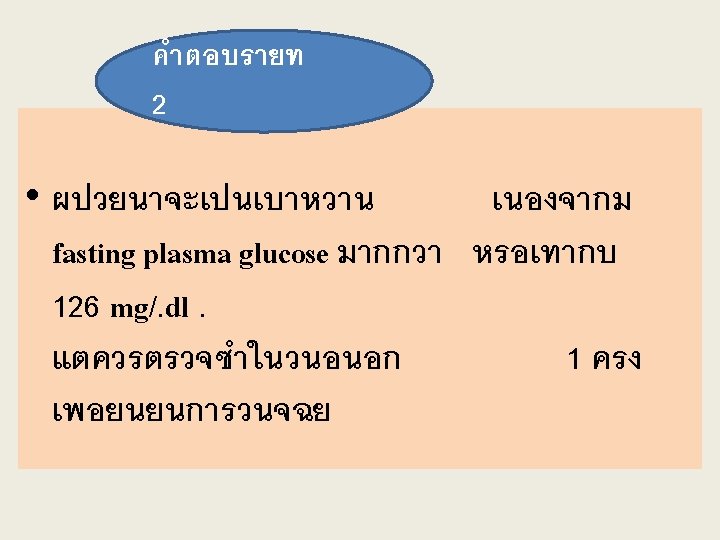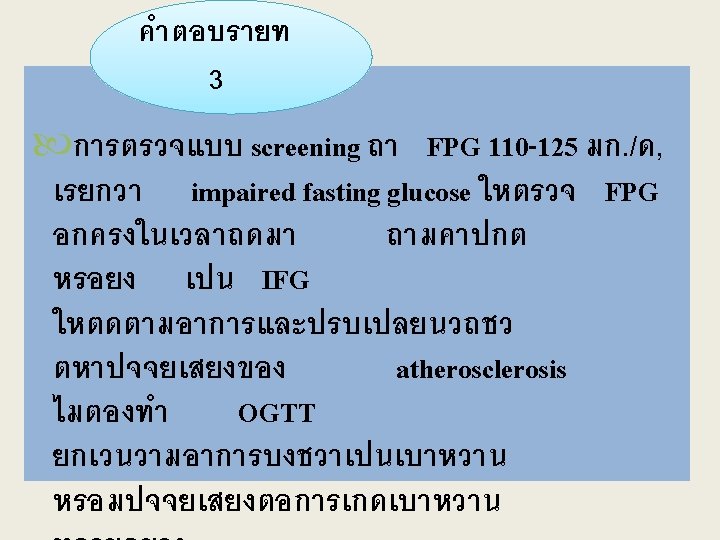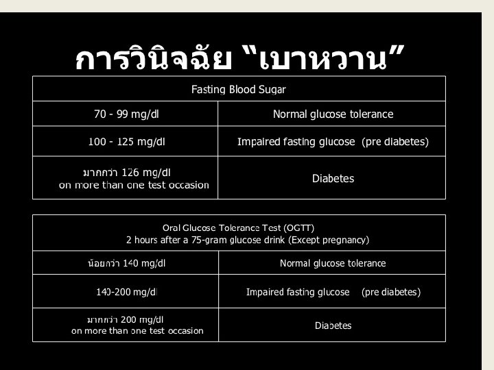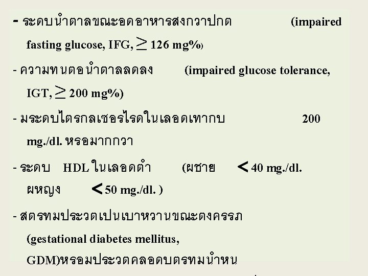 Diagnostic Levels Diabetes Fasting or 2 hour glucose load (75 gm) or both Impaired Glucose Tolerance (IGT) Fasting and 2 hour glucose load Impaired Fasting Glucose Fasting Venous plasma ≥ 126 mg/dl ≥ 200 mg/dl <126 mg/dl ≥ 140 to <200 mg/dl ≥ 100 to <126 mg/dl