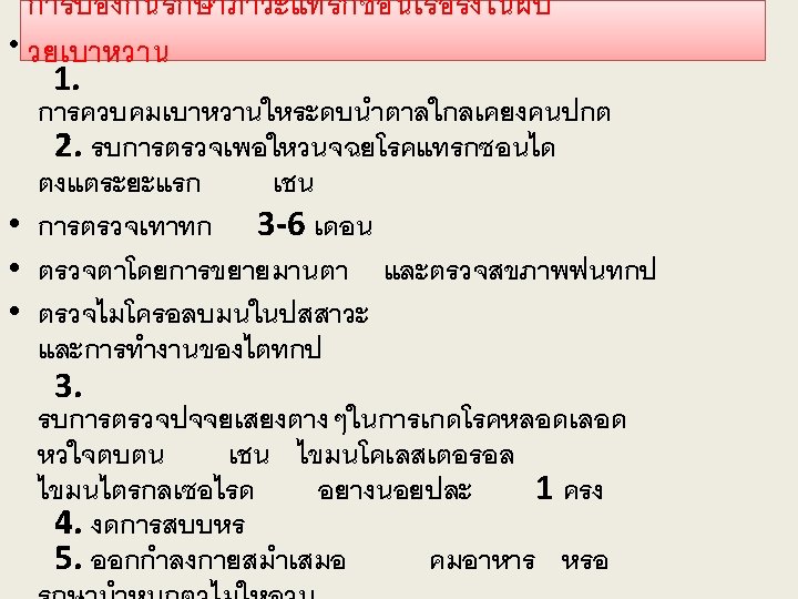 • 1. Risk for complications related to lower plasma glucose levels such as mental disorders, behavioral disorders, autonomic nerve function disorders, hypoglycemic coma Interventions: • Check serum glucose before and after meals. • Monitor: glucose, pallor, cold sweat, skin moist. • Monitor vital signs. • Monitor consciousness. • Monitor sign of nerves, irritability.