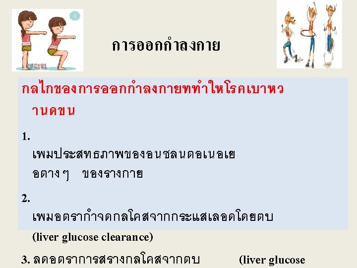 Action of Insulin Liver muscle fat cells -Increases the storage of glucose as glycogen -Stops the release of stored glucose from the liver (breakdown of glycogen) -Increased glucose uptake by muscle -Storage of fatty acids
