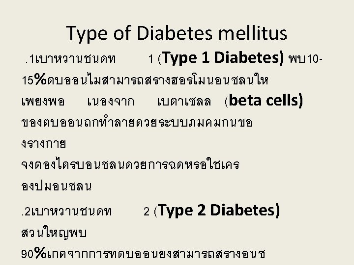 Comparison of Type 1 & 2 Diabetes Type 1 Type 2 • Ketonuria/ketoacidosis • No • Moderate-severe • Mild ketones symptoms or asymptomatic • Rapid • Slow onset • Weight • < loss/lean 30 years old • Antibody positive • C-peptide low or absent onset • Overweight • >30 years old • Antibody negative • C-peptide normal or high