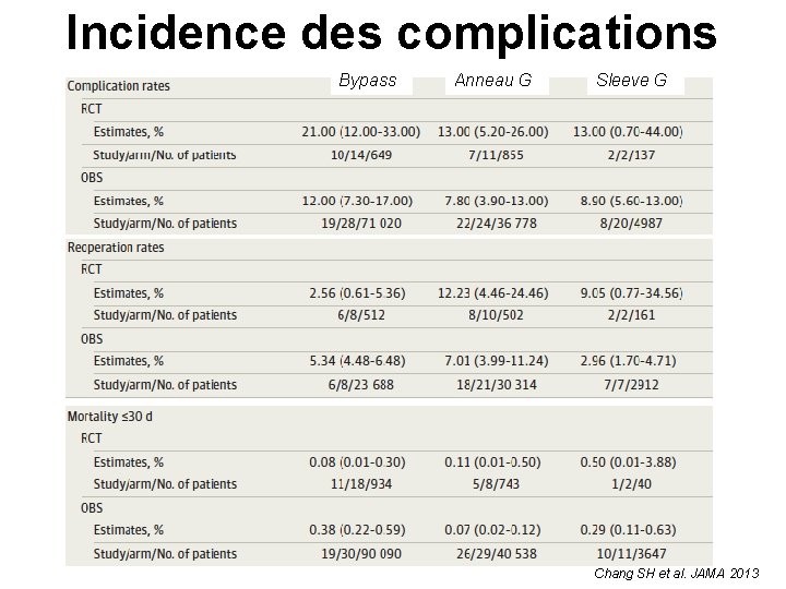 Incidence des complications Bypass Anneau G Sleeve G Chang SH et al. JAMA 2013
