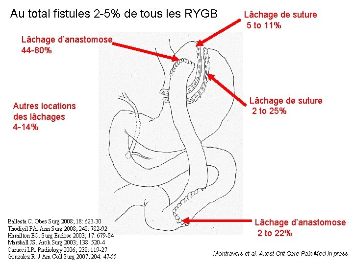 Au total fistules 2 -5% de tous les RYGB Lâchage de suture 5 to 11% Lâchage d’anastomose 44 -80% Autres locations des lâchages 4 -14% Ballesta C. Obes Surg 2008; 18: 623 -30 Thodiyil PA. Ann Surg 2008; 248: 782 -92 Hamilton EC. Surg Endosc 2003; 17: 679 -84 Marshall JS. Arch Surg 2003; 138: 520 -4 Carucci LR. Radiology 2006; 238: 119 -27 Gonzalez R. J Am Coll Surg 2007; 204: 47 -55 Lâchage de suture 2 to 25% Lâchage d’anastomose 2 to 22% Montravers et al. Anest Crit Care Pain Med in press