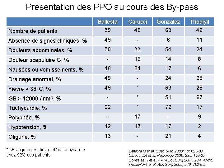 Présentation des PPO au cours des By-pass Ballesta Carucci Gonzalez Thodiyil Nombre de patients 59 48 63 46 Absence de signes cliniques, % 49 - 8 11 Douleurs abdominales, % 50 33 54 24 Douleur scapulaire G, % - 19 14 8 Nausées ou vomissements, % 18 81 17 6 Drainage anormal, % 49 - 24 28 Fièvre > 38°C, % 49 * 63 28 - * 51 67 22 * 72 17 - 9 Hypotension, % 12 15 17 2 Oligurie, % 13 - 21 4 GB > 12000 /mm 3, % Tachycardie, % Polypnée, % *GB augmentés, fièvre et/ou tachycardie chez 92% des patients Ballesta C et al. Obes Surg 2008; 18: 623 -30 Carucci LR et al. Radiology 2006; 238: 119 -27 Gonzalez R et al. J Am Coll Surg 2007; 204: 47 -55. Thodiyil PA et al. Ann Surg 2008; 248: 782 -92.