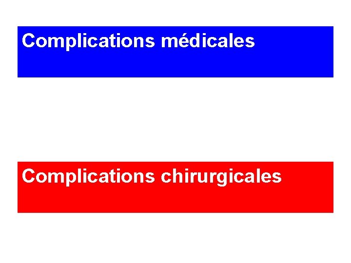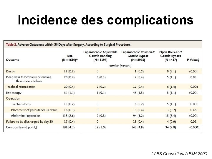 Complications médicales • • • Embolie pulmonaire Insuffisance respiratoire aigue Défaillance cardiaque Accident vasculaire cérébral Insuffisance rénale aiguë Cohorte de 13871 patients Procédures de chirurgie bariatrique variées Décès de complication médicale dans un délai moyen de 17 jours Morino M. Ann Surg 2007; 246: 1002 -9