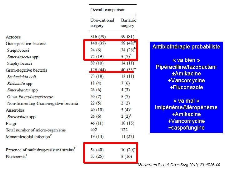 Antibiothérapie probabiliste « va bien » Pipéracilline/tazobactam ±Amikacine +Vancomycine +Fluconazole « va mal » Imipénème/Méropénème +Amikacine +Vancomycine +caspofungine Montravers P et al. Obes Surg 2013; 23: 1536 -44