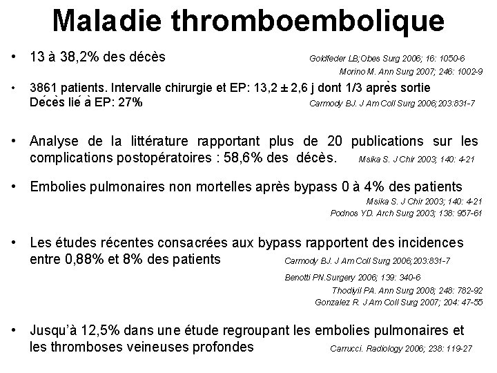 Maladie thromboembolique • 13 à 38, 2% des décès Goldfeder LB; Obes Surg 2006; 16: 1050 -6 Morino M. Ann Surg 2007; 246: 1002 -9 • 3861 patients. Intervalle chirurgie et EP: 13, 2 ± 2, 6 j dont 1/3 apre s sortie De ce s lie a EP: 27% Carmody BJ. J Am Coll Surg 2006; 203: 831 -7 • Analyse de la littérature rapportant plus de 20 publications sur les complications postopératoires : 58, 6% des décès. Msika S. J Chir 2003; 140: 4 -21 • Embolies pulmonaires non mortelles après bypass 0 à 4% des patients Msika S. J Chir 2003; 140: 4 -21 Podnos YD. Arch Surg 2003; 138: 957 -61 • Les études récentes consacrées aux bypass rapportent des incidences entre 0, 88% et 8% des patients Carmody BJ. J Am Coll Surg 2006; 203: 831 -7 Benotti PN. Surgery 2006; 139: 340 -6 Thodiyil PA. Ann Surg 2008; 248: 782 -92 Gonzalez R. J Am Coll Surg 2007; 204: 47 -55 • Jusqu’à 12, 5% dans une étude regroupant les embolies pulmonaires et les thromboses veineuses profondes Carrucci. Radiology 2006; 238: 119 -27