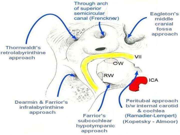 Hearing preserving approaches to petrous apex • Eagleton’s middle cranial fossa approach • Frenckner’s subarcuate approach • Thornwaldt’s retro-labyrinthine approach • Dearmin & Farrior’s infra-labyrinthine approach • Farrior’s hypotympanic sub-cochlear approach • Lempert Ramadier’s peri-tubal approach • Kopetsky Almoor’s peri-tubal approach