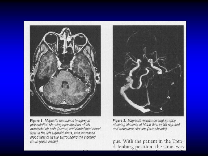 LATERAL SINUS THROMBOPHLEBITIS • • Diagnosis Fever, rigor, and sweating Headache and neck pain Tenderness and edema in the neck Manifestation of increased IC pressure Propagation and embolic manifestations Blood culture, CSF manometry CT, MRI