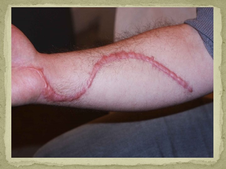 Keloid formation �Is an even greater protrusion of scar tissue �Extend beyond the wound edge �Tumors – like masses �They are permanent without any tendency to subside. �Pain, tenderness and hyperesthesia (increased sensitivity) �Scar can be excised but tend recur