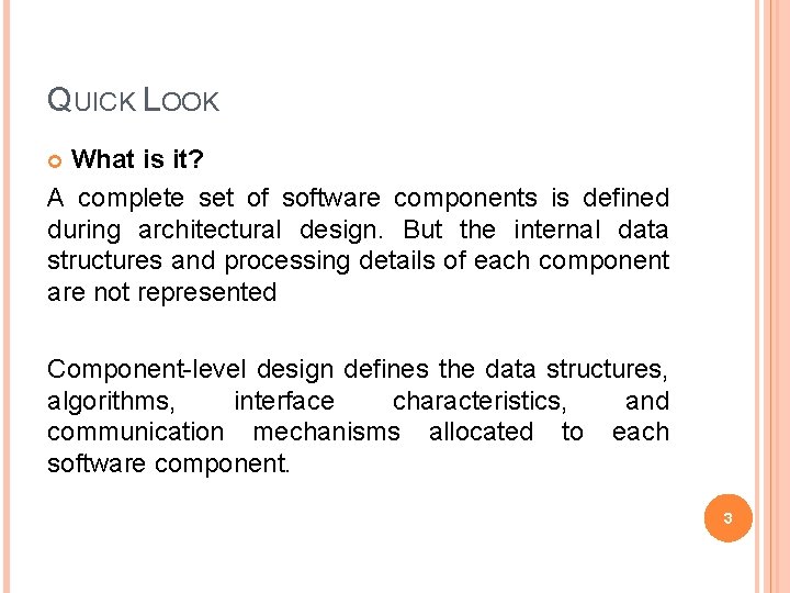 QUICK LOOK What is it? A complete set of software components is defined during architectural design. But the internal data structures and processing details of each component are not represented Component-level design defines the data structures, algorithms, interface characteristics, and communication mechanisms allocated to each software component. 3