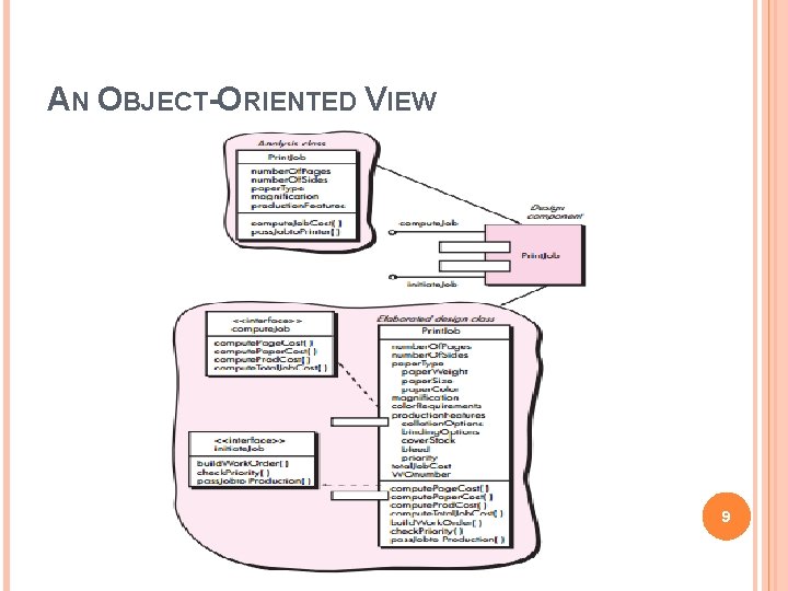 AN OBJECT-ORIENTED VIEW Each class within a component has been fully elaborated to include all attributes and operations that are relevant to its implementation All interfaces that enable the classes to communicate and collaborate with other design classes must also be defined. 8