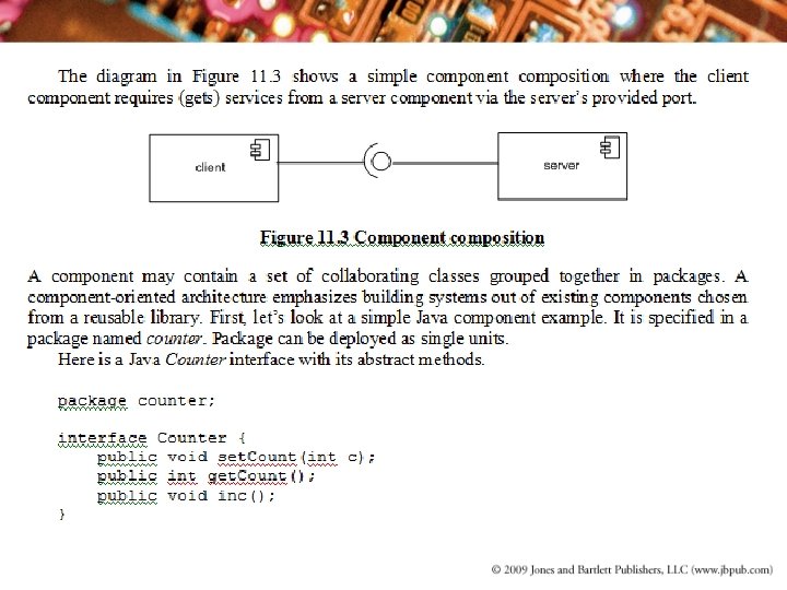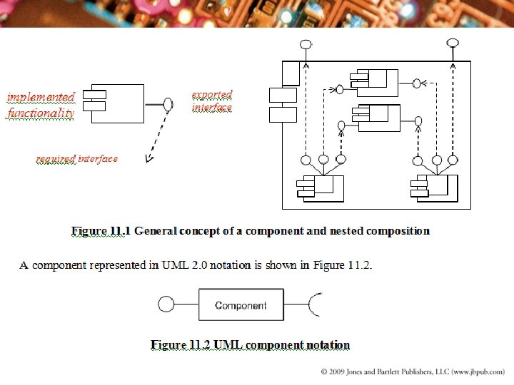 • That is, a software component can be deployed independently and is subject to composition by third parties. • In the generic model in Figure 11. 1, a component is represented by a box the inside of which is its implementation, the dark boxes on the boundary represent the exported interface elements, and the “plugs” sticking out represent required explicit context (usually plagued into another component’s interface).