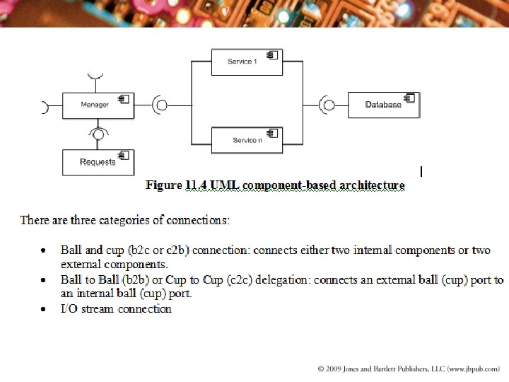 • Figure 11. 4 shows a component-based software architecture. • The manager component gets service support from a single component (requests) and a combined service component sub-system (Service 1 and Service n), and the latter gets data access service from a database. • The whole software system is a set of components connected by their interfaces. • Each component may be replaced or updated without any changes of the other part of the system.