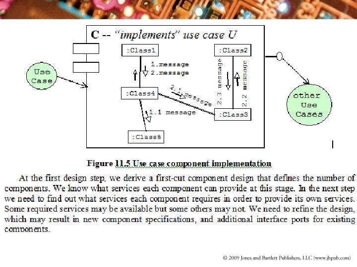 • A collaboration is any identifiable slice of functionality that describes a meaningful service, involving, in general, several concepts. • A collaboration can be seen as the implementation of a use case! Thus, for each use case U there will be a collaboration diagram “encapsulated” in a component C (one or more sequence diagrams will be drawn to exercise the use case through scenarios). • Figure 11. 5 illustrates the component implementation of Use Case U (that happens to lay in between two other use cases).