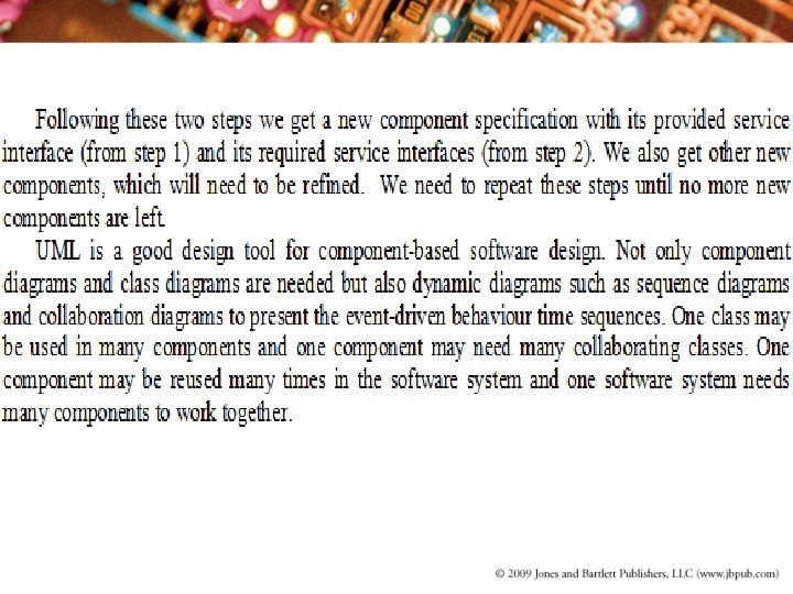 Benefits: • Reusability of components: • System maintenance and evolution: easy to change and update the implementation without affecting the rest of the system. • Independency and flexible connectivity of components • Independent development of components by different group in parallel • Productivity for the software development and future software development • Many OO design tools can also be used for Component-Based Software Development.