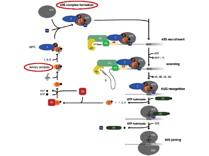 Scanning § 40 S, ATP, e. IF 2, e. IF 4 A, e. IF 4 B, e. IF 4 F, m. RNA sufficienti per formare complesso I (non produttivo) § e. IF 1, e. IF 1 A necessari per il complesso II (scanning fino all’AUG) § Se non ci sono strutture secondarie e. IF 4 A, 4 B, 4 F non sono necessari (in vitro)