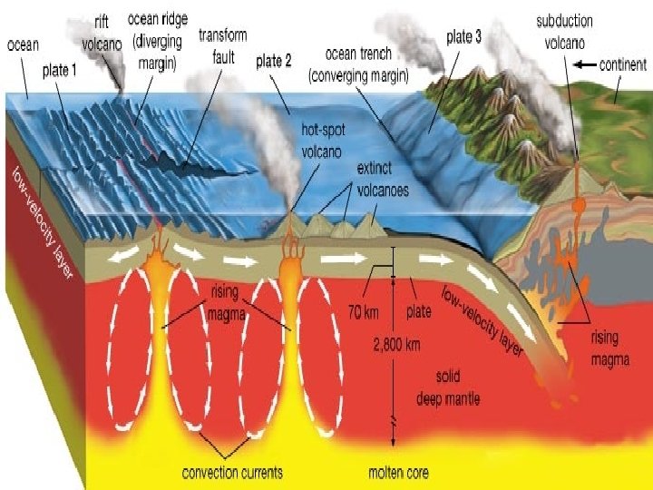 • Asthenosphere – Solid layer of rock beneath the lithosphere – Flows very slowly allowing tectonic plates to move an top of it • Outer core – Dense liquid layer • Inner core – dense mostly made up of metals iron and nickel
