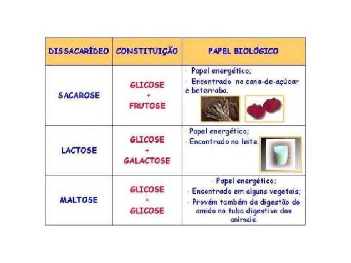 Dissacarídeos Açúcar Composição Fonte Sacarose Glicose + frutose Cana-de-açúcar Lactose Glicose + galactose Leite Maltose Glicose + glicose Malte