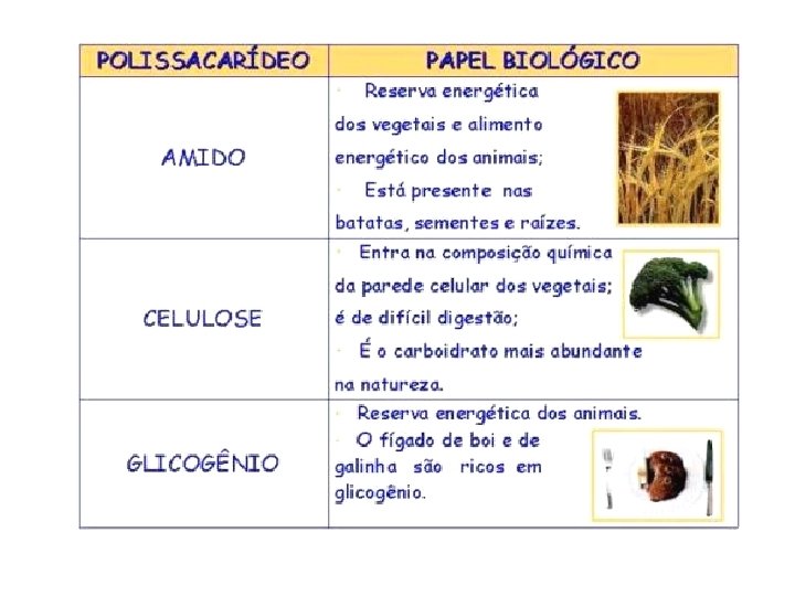 Polissacarídeos AMIDO GLICOGÊNIO CELULOSE QUITINA É a substância de reserva energética vegetal. É encontrado no trigo, no arroz, na batatainglesa, na mandioca, etc. É a substância de reserva energética animal e dos fungos. No homem é encontrado principalmente nos músculos e no fígado. Constitui o principal componente estrutural da parede celular das células vegetais. Não servem como fonte de energia. Componente do exoesqueleto dos crustáceos e insetos.