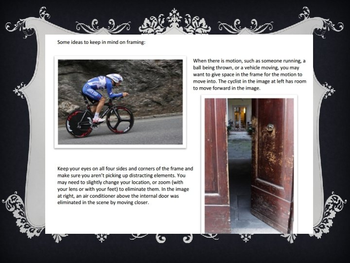 FRAMING Consider using a “frame within a frame” to highlight a subject. Looking through trees, windows, doors, or into mirrors can all be effective "frame within a frame" techniques.