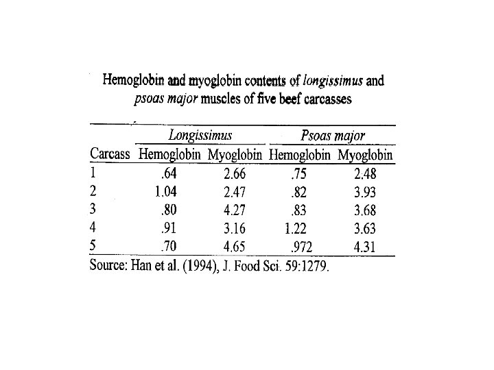 More About Pigments • Meat color reactions are very important to its appearance and will be studied later in detail. A sample will be shown later. • Which of the two pigments (hemoglobin or myoglobin) is predominant in postmortem muscle? Why?