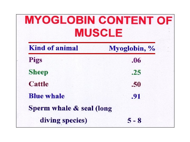 KINDS OF PROTEIN IN MUSCLES • Myofibrillar - 9. 5% – Principal ones are Actin and Myosin • Sarcoplasmic - 6. 0% – – Enzymes and pigments. The two principal pigments are Myoglobin and Hemoglobin in red blood cells Carries O 2 from the lungs to cells. Myoglobin Stores O 2 in the cells.