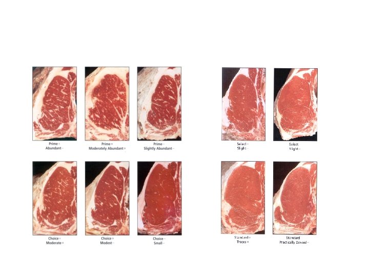 Fat, Protein and Caloric Content of Differing Beef Quality Grades Quality Grade Marbling Fat, % Calories Protein, % Calories from Fat Protein Total Calories Select Slight 3. 7 66 26 208 275 Low Choice Small 5. 2 93 25. 6 204 298 Mid Choice Modest 6. 7 120 25. 2 201 322 8. 2 147 24. 8 198 346 High Choice* Moderate * Meets marbling specification for Certified Angus Beef products
