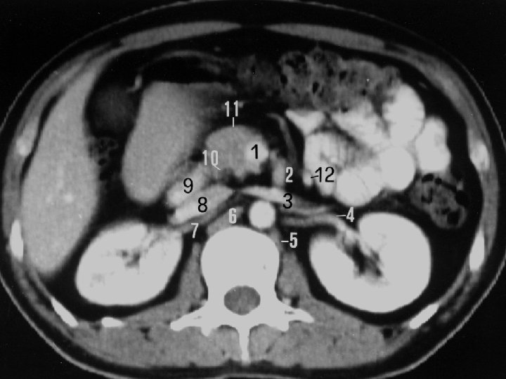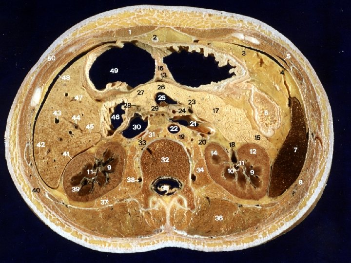 • Anteriorly – Left kidney • Stomach (superior), • Pancreas (middle), • Loops of intestine and left colic flexure (inferiorly) – Right kidney • Right lobe of liver (superior) • Right colic flexure (inferior) • Descending part of duodenum (medially)