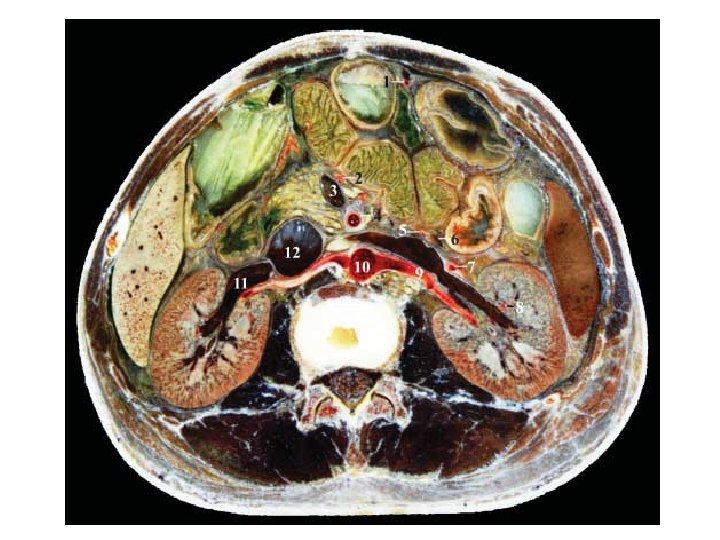 • • Left kidney lies at the level from the lower border of T 11 to L 2; the 12 th rib is behind its middle part of the post surface Right kidney lies slightly lower than the left kidney, at the level from the upper border of T 12 to L 3; the 12 th rib is behind its upper part of the post surface 肾门Renal hilum at the level of L 1, is about 5 cm from the posterior median line 肾区Renal region-the area between 12 th rib and the lateral margin of erector spinae
