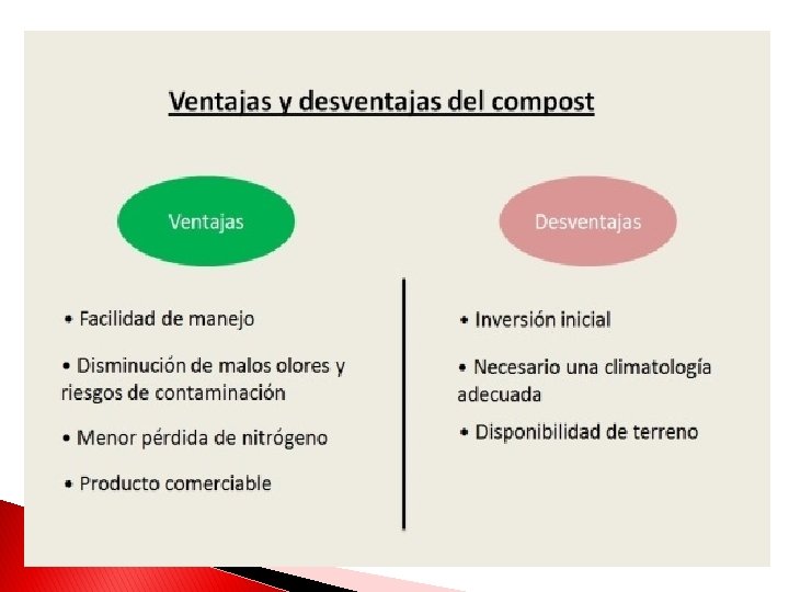 Desventajas � Algunos de los inconvenientes asociados al compostaje radica en las emisiones generadas durante el proceso como la generación de lixiviados, olores y polvos. � En aquellos procesos más avanzados, el uso de energía puede ser considerable, presentando costos importantes. � En el caso de compostar residuos verdes, puede ocurrir que la presencia de algunos herbicidas no desaparezcan luego del proceso de compostaje, obteniendo un producto de menor calidad y de afectación al tracto de animales.