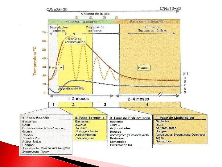 � Libera dióxido de carbono y agua a la vez que se generan sustancias minerales, como principales productos de la biodegradación. Idealmente, los productos finales de un sistema de compostaje bien manejado son dióxido de carbono, vapor de agua, calor, materia orgánica estabilizada y amoníaco, aunque la proporción de éstos varía con la disponibilidad de carbono y nitrógeno.