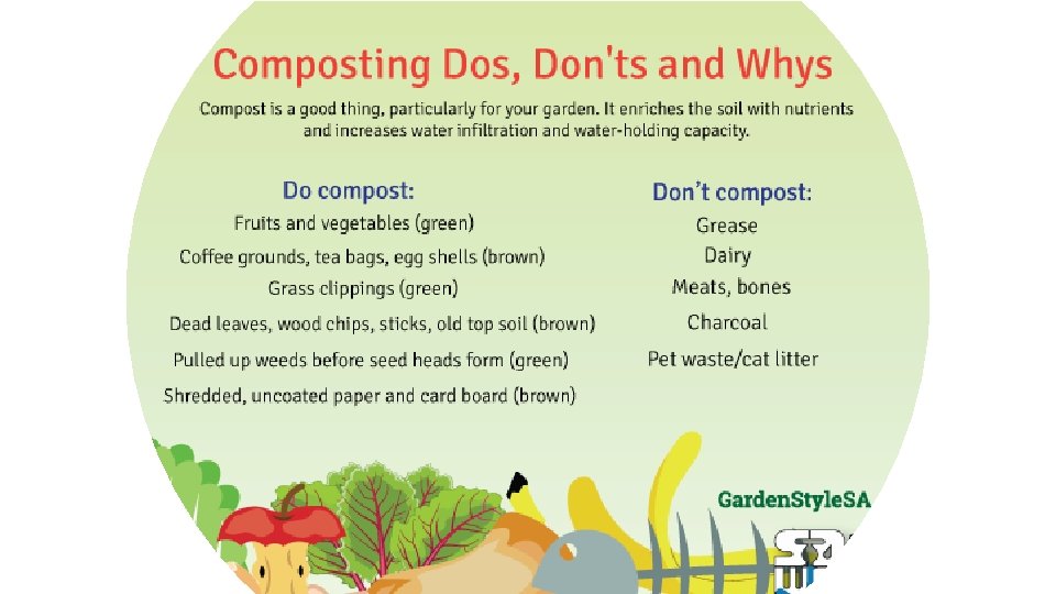 Setting up Indoor Composting (cont. ) • Create an environment for your worms! • You will need 2 -3 bins of medium to large size with lids. Size can vary but ideal size is 30 in long and 12 in deep. Leave the first bin as is. This will catch all of the liquid that will come out of the compost (called compost “tea”, also very good for your plants!) For the next bin(s), drill holes in the bottom and along the top edge. This will allow excess moisture to drain out and provide aeration. Holes should also be drilled into the lid. • Layer your bins. The bottom layer should be bedding for your worms, which should be some sort of browns, i. e. shredded paper, dried leaves, etc. The second layer should be a mixture of food for the worms and rich dark soil. The third layer should once again be a layer of browns, which will help insulate and cut down on smell, cutting down on flies and pests. • Be careful what you feed them. Indoor composting is slightly more restrictive than outdoor, as your worms have restrictions as what they can and cannot eat. All fruit and vegetable scraps are fine, just watch out for garlic and onion scraps as they are too acidic for them.