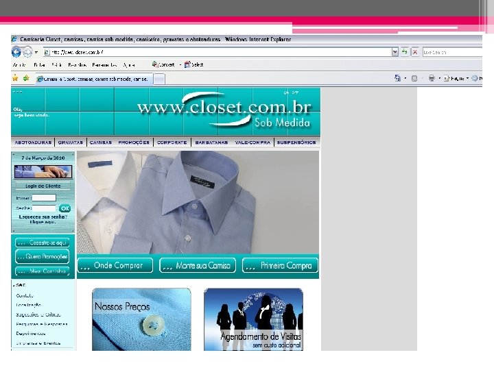 Exemplos: • É o caso, por exemplo, da Closet, a primeira camisaria digital sob medida do Brasil, onde o consumidor pode escolher vários tecidos, cores, colarinhos, bolsos e montar sua própria camisa, de acordo com suas medidas.