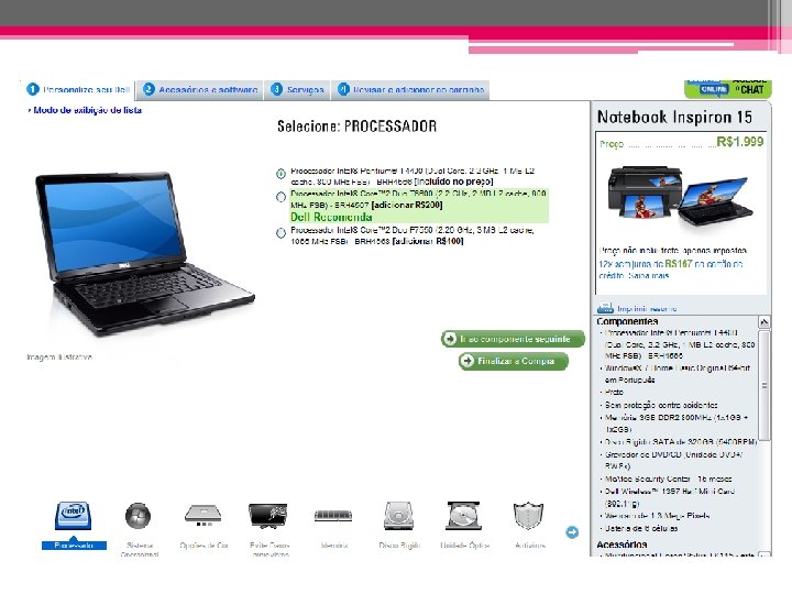• O mesmo acontece com os fabricantes de computadores como a Dell, que permitem que o cliente defina a configuração do microcomputador que deseja adquirir. Nestes casos, o Produto deixade ser uma variável totalmente controlada pelo executivo de marketing. • A ele cabe a tarefa de definir quais variações do mesmo produto serão disponibilizadas ou quais opções de combinações serão oferecidas. • Em alguns casos, o número de combinações possíveis é expressivo, e a tecnologia pode facilitar a simulaçãoou a escolha, em tempo real.